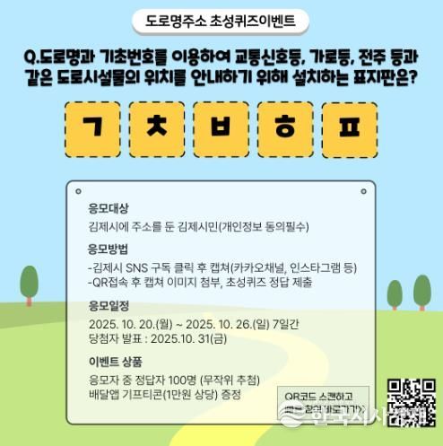 한국시사경제 김숙영 기자 | 김제시는 도로명주소에 대한 시민들의 관심과 이해를 높이고 올바른 주소 사용을 장려하기 위해 오는 20일부터 26일까지 도로명주소 초성퀴즈 이벤트를 실시한다고 밝혔다.