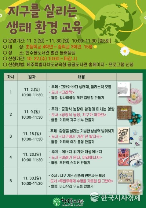 한국시사경제 노승선 기자 | 제주도교육청 한수풀도서관은 그림책 속 생태·환경 이야기를 통해 어린이와 청소년이 생활 속 환경보호의 중요성을 이해하고 자연에 대한 감수성을 기를 수 있는 ‘2025년 지구를 살리는 생태·환경 교육’ 참가자를 모집한다.