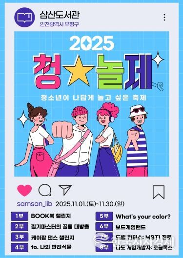 한국시사경제 문화팀 | 부평구 구립 삼산도서관은 11월 한 달간 청소년(중학교 1학년~고등학교 3학년) 대상 문화체험 프로그램 ‘청★놀제: 청소년이 나답게 놀고 싶은 축제’를 운영한다.