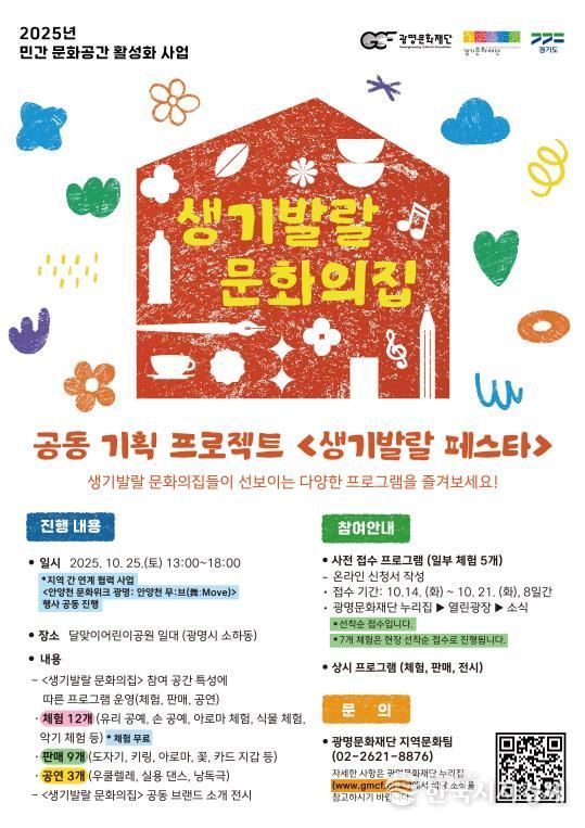 한국시사경제 경기취재본부 | (재)광명문화재단은 2025년 민간 문화공간 활성화 사업 '생기발랄 문화의집' 공동 기획 프로젝트 ‘생기발랄 페스타’를 10월 25일 오후 1시에 달맞이어린이공원에서 개최한다.