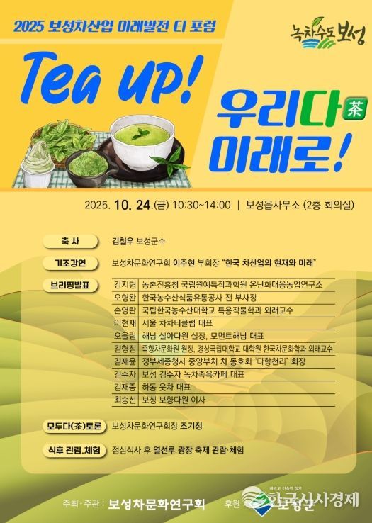 10월 24일 열리는 보성읍사무소에서 열리는 ‘보성차산업 미래 발전 티 포럼’은 국내 차전문가와 학계 인사가 모여 현재 차산업 트렌드를 공유하고 미래 발전 방향을 논의하는 자리로 마련된다.
