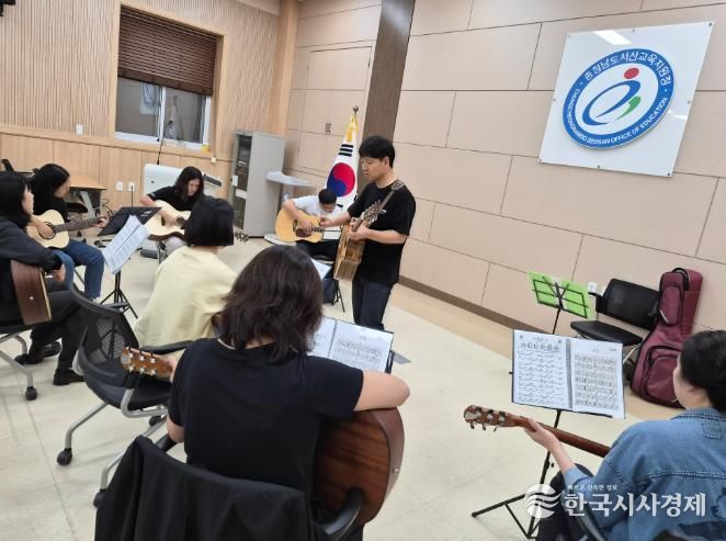 한국시사경제 충남취재본부 | 충청남도서산교육지원청이 학부모들의 바쁜 일과를 고려하여 저녁 시간을 활용한‘마음토닥 통기타교실’을 운영하며 큰 호응을 얻고 있다.
