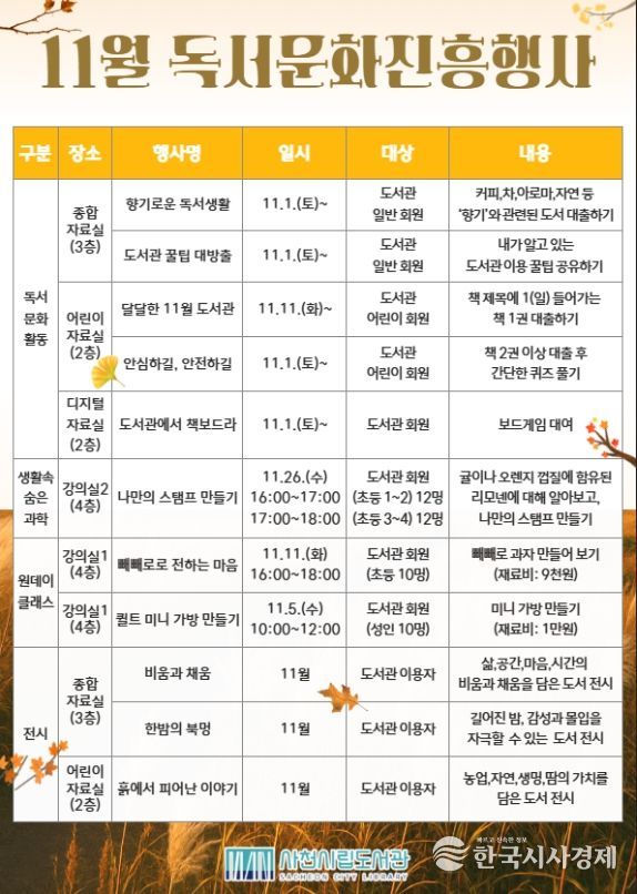 한국시사경제 권충현 기자 | 사천시는 사천시립도서관에서 11월 한 달 동안 책과 함께 여유로운 시간을 보내며 감성을 채울 수 있는 다양한 독서문화행사와 체험 프로그램을 운영한다고 17일 밝혔다.