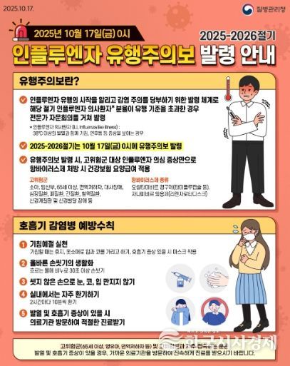 한국시사경제 노승선 기자 | 질병관리청은 인플루엔자 환자 수 증가에 따라, 10월 17일 0시부터 “인플루엔자 유행주의보”를 발령한다고 밝히고, 인플루엔자 예방접종 및 호흡기감염병 예방수칙 준수를 당부했다.
