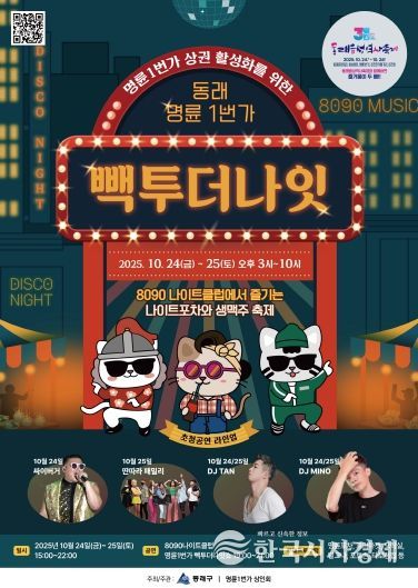 한국시사경제 오영주 기자 | 부산 동래구는 오는 10월 24일부터 25일까지 이틀간 오후 3시부터 10시까지 명륜1번가 일대에서 ‘명륜1번가 나이트 페스티벌(빽투더나잇)’을 개최한다고 밝혔다.