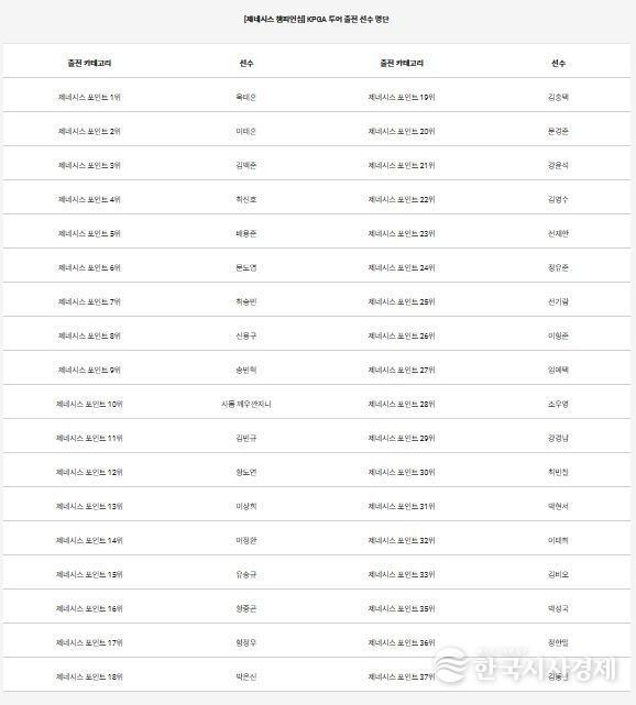 제네시스 포인트 1위 옥태훈(27.금강주택)을 비롯해 2위 이태훈(35.캐나다), 3위 김백준(24.속초아이), 4위 최진호(41.COWELL), 5위 배용준(25.CJ), 6위 문도엽(34.DB손해보험), 7위 최승빈(24.CJ), 8위 신용구(34.금강주택), 9위 송민혁(21.CJ), 10위 사돔 깨우깐자나(27.태국)까지 제네시스 포인트 TOP10 선수들과 36위 정한밀(34.경희), 37위 김동민(27.NH농협은행)까지 제네시스 포인트 상위 36명이 참가자 명단에 이름을 올렸다.