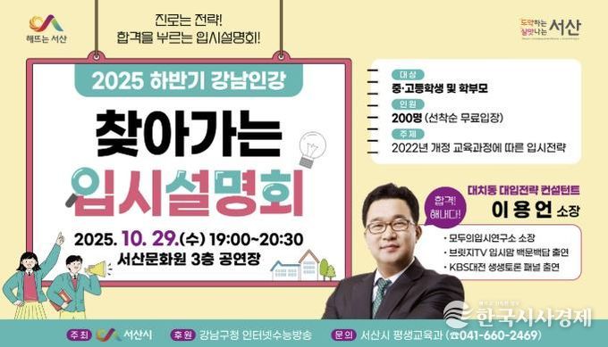 설명회는 입시 현장에서 활동해 온 이용언 소장이 진행하며 ▲개정 교육과정의 핵심 변화 ▲대입 전형별 준비 전략 ▲학생부 관리 방법 등을 서산시 교육 특성에 맞춰 설명할 계획이다.