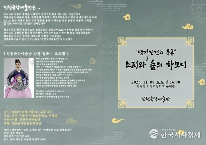 한국시사경제 김태훈 기자 | (재)생거진천문화재단은 오는 11월 8일 오후 4시 이월초등학교 ‘무제관’에서 진천국악예술단이 ‘진천의 풍류, 소리와 춤의 하모니’ 공연을 개최한다고 20일 밝혔다.