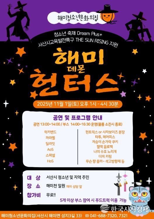 한국시사경제 충남취재본부 | 해미청소년문화의집은 오는 11월 1일, 해미천 일원에서 K-POP 데몬 헌터스(케데헌) 콘셉트를 바탕으로, 전통문화와 청소년의 감성을 결합한‘2025년 청소년 축제 Dream Plus+ 해미 데몬 헌터스’행사를 개최한다고 전했다.