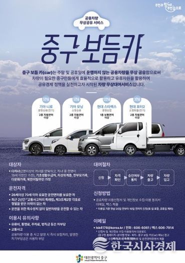 한국시사경제 대전취재본부 | 대전 중구는 지난 4월 21일부터 대전 최초로 시행한 공용차량 무상대여 서비스 ‘보듬카’가 시민들에게 큰 호응을 얻고 있다고 밝혔다.