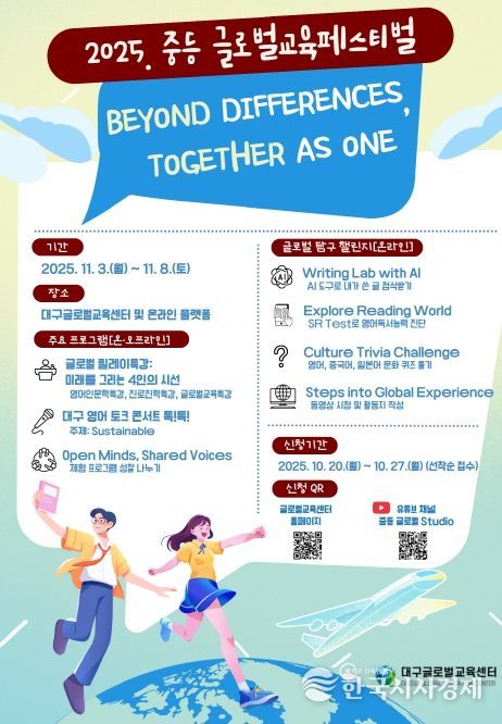 한국시사경제 대구취재본부 | 대구교육연수원 산하 대구글로벌교육센터는 11월 3일부터 8일까지 ‘Beyond Differences, Together as One(차이를 넘어, 하나로)’을 주제로 '2025 중등 글로벌교육페스티벌'을 개최한다.