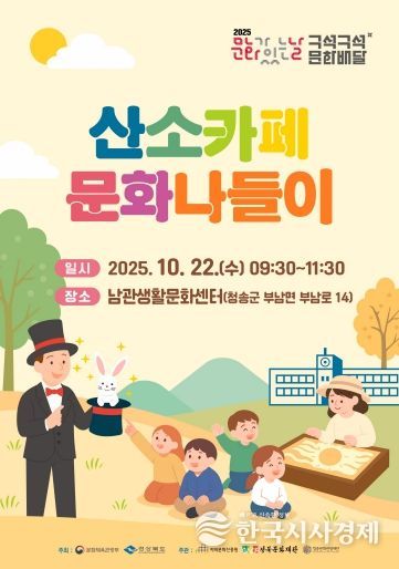 한국시사경제 권충언 기자 | (재)청송문화관광재단은 오는 10월 22일과 11월 25일 청송군 부남면 남관생활문화센터에서 2025 문화가 있는 날 '구석구석 문화배달' 사업의 일환으로 ‘산소카페 문화나들이’ 행사를 개최한다.