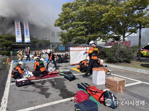 특히 현장에는 소방헬기, 신형소방차, 기상관측차량, 구급차, 드론, 굴삭기 등 다양한 장비가 동원됐으며, 폭발음, 연막탄 등도 활용되어 실제 재난현장과 같은 장면을 연출해, 훈련 참가자들은 상황전파는 물론, 긴급구조 활동 및 수습·복구활동까지 재난상황 전반에 대해 각자 맡은 바 임무를 충실히 수행했다.