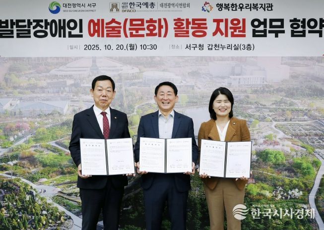 한국시사경제 문화팀 | 대전 서구는 발달장애인 문화예술 활동 지원을 위해 (사)한국예총 대전광역시연합회 및 행복한우리복지관과 3개 기관 업무협약을 체결했다고 20일 전헀다.