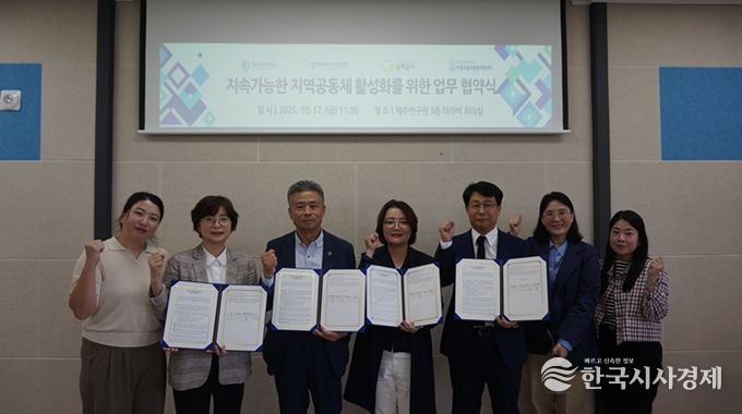한국시사경제 문화팀 | 제주연구원(원장 유영봉) 제주사회복지연구센터(센터장 오윤정)는 2025년 10월 17일, 지속가능한 지역공동체 활성화를 위해 제주특별자치도 지속가능발전협의회, 일배움터, 제주특별자치도 마을만들기종합지원센터와 업무협약을 체결했다.