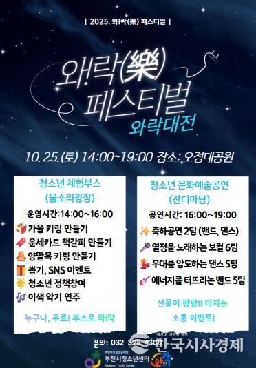 한국시사경제 경기취재본부 | 부천여성청소년재단이 운영하는 부천시청소년센터는 오는 10월 25일 오후 2시, 부천 오정대공원에서 와!락(樂) 페스티벌 ‘와락대전’을 진행한다고 밝혔다.