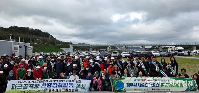 한국시사경제 사회팀 | 경주시시설관리공단(이사장 김진태)은 10월 20일, 경주 제1·제2 파크골프장 일원에서 '2025 APEC 정상회의 경주'개최의 성공을 기원하며 유관기관 합동 환경정화 활동을 진행했다.