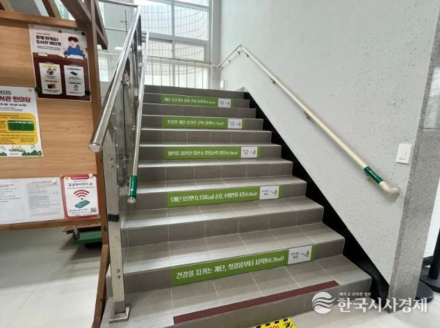 한국시사경제 노승선 기자 | 서귀포시는 지역주민과 관내 사업장 직원들의 일상 속 걷기 실천과 금연・절주 등 건강생활 확산을 유도하기 위해 제남도서관 1~3층 계단에 ‘건강계단’을 조성했다.