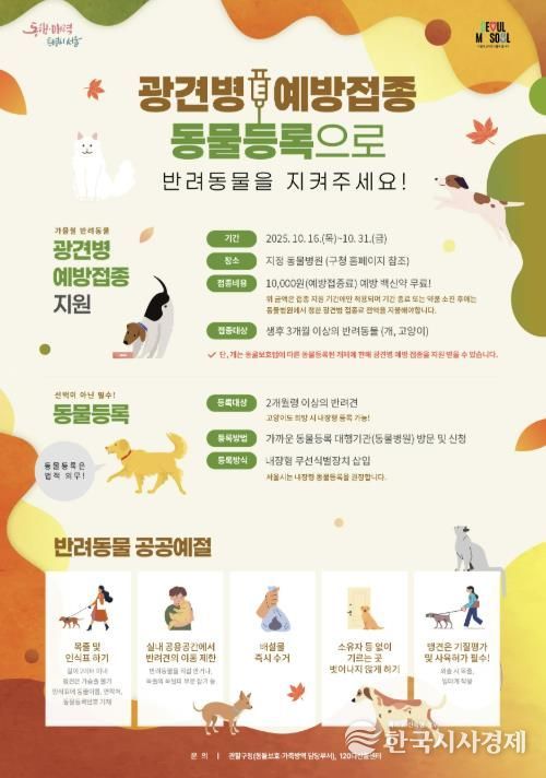 한국시사경제 노승선 기자 | 마포구는 10월 31일까지 광견병 발생 및 확산을 예방하기 위해 관내 40곳 동물병원에서 ‘2025년 가을철 광견병 예방접종’을 실시한다.