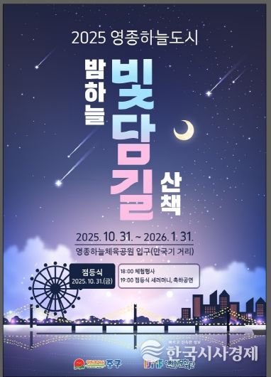 한국시사경제 기동취재팀 | (재)인천중구문화재단(이사장 김정헌)은 올해 10월 31일부터 오는 2026년 1월 31일까지 3개월간 야간 경관조명 ‘2025 영종 빛 축제 - 영종하늘도시 밤하늘 빛담길’을 운영한다고 밝혔다.