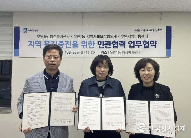 한국시사경제 사회팀 | 수원시 팔달구 우만1동 지역사회보장협의체, 행정복지센터는 지난 20일, 우만지역아동센터와 위기 아동의 조기 발견 및 지원 강화를 위한 업무협약을 체결했다.