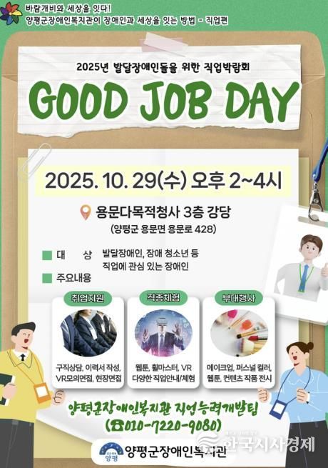 한국시사경제 윤광희 기자 | 대한불교조계종사회복지재단이 운영하는 양평군장애인복지관은 오는 29일 오후 2시부터 4시까지 용문다목적청사 3층 강당에서 발달장애인의 직업 탐색 기회를 지원하기 위한 직업박람회 ‘GOOD JOB DAY’를 개최한다.