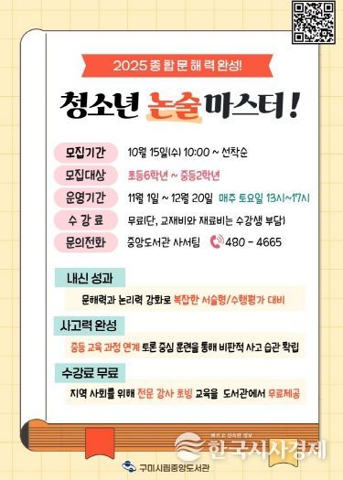 한국시사경제 경북취재본부 | 구미시립중앙도서관은 청소년들의 기초 문해력과 논리적 사고력 향상을 위해 마련한 논술특별프로그램 ‘청소년 논술마스터’ 수강생을 시립중앙도서관 누리집에서 선착순으로 모집하고 있다.