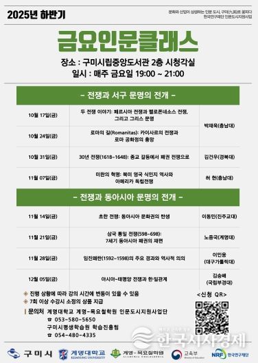 강좌의 대주제는 '전쟁사와 문명의 전개’로 전쟁이 단순한 충돌이 아닌 문명을 재편시키는 동력으로 작용해 온 역사적 의미를 동서양 전쟁사를 통해 탐구한다. 강좌는 10월 17일부터 12월 5일까지 매주 금요일 오후 7시부터 9시까지, 구미시립중앙도서관 시청각실에서 총 8회에 걸쳐 진행된다.