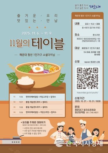 한국시사경제 김숙영 기자 | 해운대구는 11월 6~9일 청년 1인 가구를 위한 소셜다이닝 ‘11월의 테이블’을 연다.