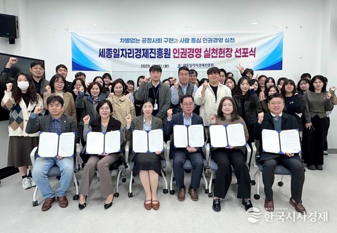 한국시사경제 세종취재분부 | 세종일자리경제진흥원(원장 이홍준)은 21일 본원 2층 교육실에서 ‘인권경영 실천헌장 선포식’을 열고 모든 임직원이 인권을 경영의 핵심 가치로 삼아 실천해 나갈 것을 다짐했다.