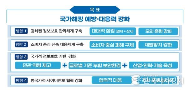 한국시사경제 디지털 뉴스팀 | 과학기술정보통신부와 관계부처는 전방위적인 해킹 사고로 국민 불안이 가속화되는 현 상황을 신속히 극복하고 국가 전반의 정보보호 역량을 강화하기 위해 '범부처 정보보호 종합대책'을 수립하여 10월 22일 대국민 브리핑을 통해 발표했다.