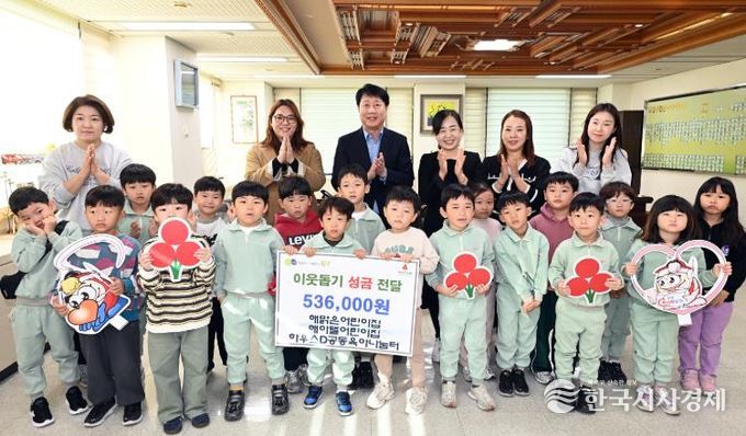 한국시사경제 사회팀 | 부평구는 27일 해맑은어린이집·해아뜰어린이집·하우스D공동육아나눔터가 함께 모은 이웃돕기 성금 53만6천원을 전달받았다.