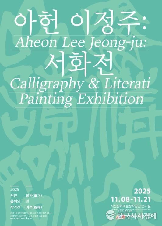 한국시사경제 김태훈 기자 | (재)서천문화관광재단은 다음달 8일부터 21일까지‘2025 서천 올해의 작가전’ 세 번째 사업으로 서예 분야 ‘이정주 – 필하의 여정(筆下의 旅程)’ 전시회를 서천문화예술창작공간 전시실에서 개최한다고 밝혔다.