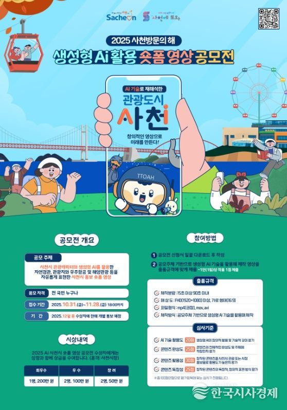 한국시사경제 윤광희 기자 | 사천시는 2025 사천방문의 해를 맞아 시의 관광자원과 관광 캐릭터에 대한 관심과 인지도를 제고하기 위한 생성형 AI 활용 숏폼 영상 공모전을 10월 31일부터 11월 28일까지 개최한다.