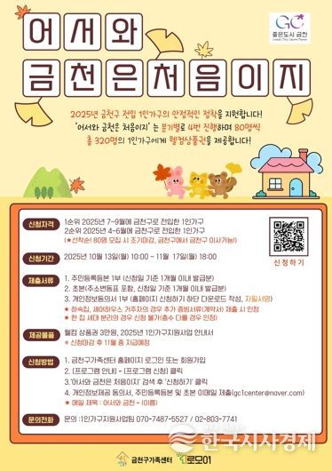 한국시사경제 기동취재팀 | 금천구는 2025년 금천구로 전입한 1인가구를 돕기 위해 17일 오후 6시까지 ‘어서와 금천은 처음이지’ 3분기 신청자를 모집한다고 밝혔다.