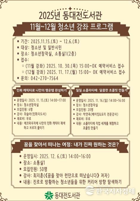 한국시사경제 대전취재본부 | 동대전도서관은 11월 15일부터 12월 6일까지 청소년을 대상으로 ‘청소년, 나를 발견하고 꿈을 그리다’를 주제로 한 문화예술·진로 강좌를 운영한다.