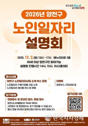행사 참여를 원하는 어르신은 이달 21일까지 양천시니어클럽 또는 QR코드를 통해 사전 신청할 수 있으며, 행사 당일 현장 접수도 가능하다.