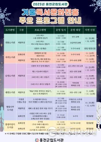 한국시사경제 권충언 기자 | 홍천군립도서관은 겨울철 독서 의욕 고취와 도서관 이용 활성화를 위해 11월 21일부터 12월 24일까지 연봉도서관, 서석도서관, 남면도서관, 내면도서관, 별빛나루도서관, 홍천어린이도서관 등 6개 도서관에서 ‘겨울과 크리스마스’를 주제로 한 독서문화진흥 프로그램을 운영한다.