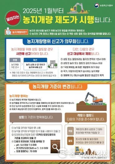 한열 농업기술센터소장은 “농지개량 사전 신고 없이 절·성토를 진행하다가 위반 사항이 적발될 경우 원상회복명령 등 행정처분과 함께 형사처벌을 받을 수 있다.”라며, “농지 절·성토를 계획 중인 농업인은 반드시 사전 신고 절차를 준수해 주시길 바란다.”라고 말했다.