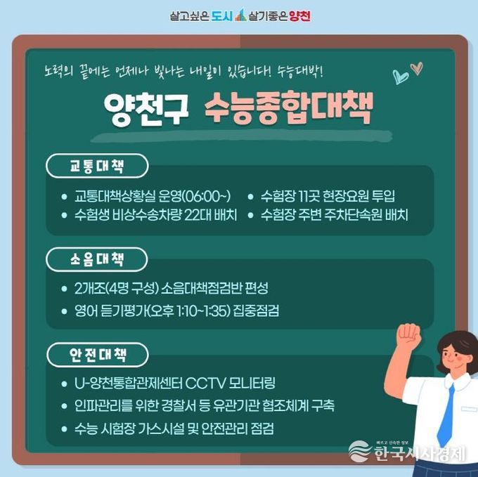 한국시사경제 기동취재팀 | 양천구는 오는 13일 실시되는 ‘2026학년도 대학수학능력시험’에 응시하는 관내 수험생 5천8백여 명을 위한 교통·소음·안전 등 전방위 수능 종합대책을 마련하고 본격적인 지원에 나선다.