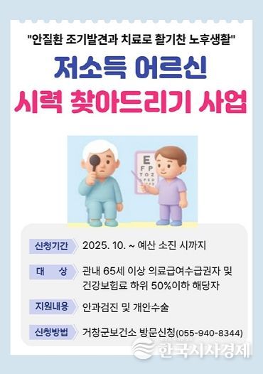 한국시사경제 의료보건팀 | 거창군은 고향사랑기부제 지정기부사업으로 추진 중인 ‘저소득 어르신들의 시력 찾아드리기 사업’이 10월 시작 이후 꾸준히 이어지며, 시력 회복 지원을 받은 어르신들로부터 큰 호응을 얻고 있다고 11일 밝혔다.