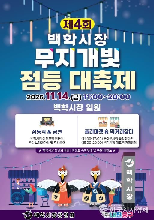 구 관계자는 “백학시장은 오랜 시간 지역 상인과 주민이 함께 지켜온 생활공간”이라며 “이번 점등식이 시장의 밤을 밝히듯, 전통시장에 새로운 활력을 불어넣고 보다 많은 방문객이 찾아오는 계기가 되길 바란다”고 전했다.