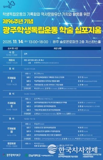 한국시사경제 광주취재본부 | 광주광역시 북구가 오는 14일 광주 솔로몬로파크 저스티스홀에서 ‘학생독립운동 96주년 기념 학술 심포지엄’을 개최한다고 13일 밝혔다.