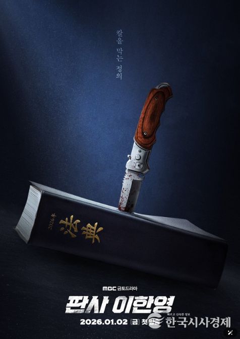 오늘(18일) 공개된 1차 티저 포스터는 작품의 분위기를 단번에 보여주는 상징적 이미지로 시선을 압도한다. 피가 묻은 칼이 두꺼운 법전에 깊게 꽂혀 있는 모습은 강렬한 충격과 함께, 법을 무기로 삼아 정의를 구현하고자 하는 판사 이한영의 단단한 의지를 직관적으로 드러낸다.