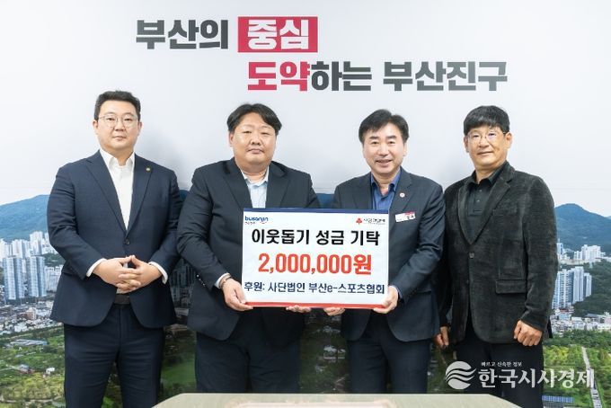 한국시사경제 부산취재본부 | 부산 부산진구는 11월 18일, (사)부산이스포츠협회(회장 지창우)에서 부산진구청을 방문하여 이웃돕기 성금 200만 원을 기탁했다고 밝혔다.
