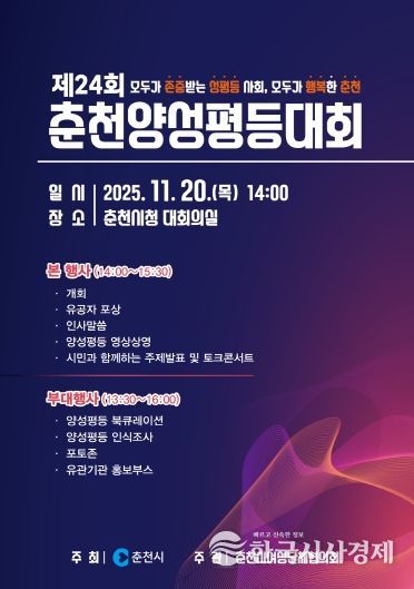 한국시사경제 권충언 기자 | 춘천시가 주최하고 춘천시여성단체협의회가 주관하는 ‘제24회 춘천양성평등대회’가 20일 오후 2시 시청 대회의실에서 열린다.
