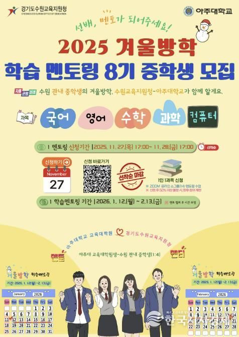 한국시사경제 기동취재팀 | 경기도수원교육지원청은 2026년 1월 12일부터 2월 13일까지 관내 중학생을 대상으로 '2025 겨울방학 학습 멘토링 8기'를 운영한다. 이번 프로그램은 ZOOM을 활용한 비대면 소그룹(1:4) 멘토링으로 진행되며, 아주대학교 교육대학원과 협력해 운영하는 교육 기부 기반 상생 프로그램이다.