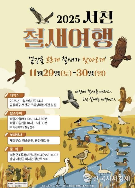 서천군과 서천군철새여행행사추진위원회가 주최·주관하는 ‘2025 서천 철새여행’이 오는 29일부터 30일까지 이틀간 서천군 조류생태전시관 일원에서 올해도 다채로운 프로그램과 함께 진행된다.
