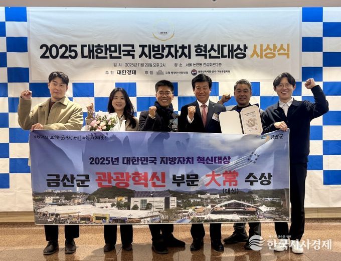 한국시사경제 김태훈 기자 | 금산군은 20일 서울시 강남구 논현동 건설회관에서 열린 2025 대한민국 지방자치 혁신대상 시상식에서 관광혁신부문 대상을 받았다.