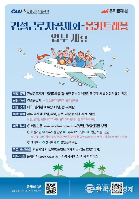 혜택 적용 기간은 2025년 11월 24일부터 2026년 11월 23일까지 1년이며, 상호 합의에 따라 연장할 수 있다. 이용절차는 몽키트래블 앱 설치 후 회원가입, 제휴회원 인증, 제휴 코드 입력을 통해 건설근로자공제회 법인회원으로 전환하면 된다. 제휴 코드는 공제회 홈페이지를 통해 확인할 수 있다.